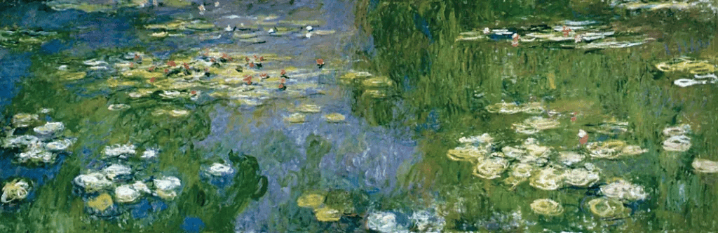 这些珍贵的花朵漂浮着,在《睡莲》中,那蓝绿色、流动如液体般的水面上缓缓游移,几乎察觉不到它们的运动。画面唤起一种梦幻般的安适感,仿佛世界放慢了速度,甚至时间本身也彻底停驻。莫奈本人曾将这种体验类比为诗歌与音乐,他提到法国诗人马拉美,也提到德彪西——后者正是在1905年创作了《水中的倒影》。